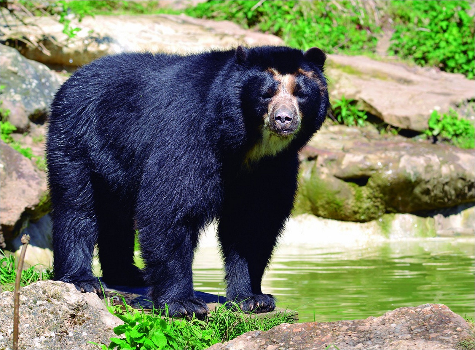 The spectacled bear, a symbol of the Peruvian Andes, lives in the cloud forests surrounding Machu Picchu. It is a solitary, mostly herbivorous species recognized by the pale markings around its eyes. In this region, it thrives among humid slopes and lush vegetation. Its presence supports ecological balance by dispersing seeds and shaping natural pathways. Although elusive, its protection is essential, as it is a threatened species that reflects the biological and cultural richness of the Peruvian Andes.