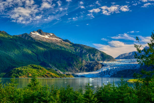 The Mendenhall Glacier, located near Juneau, Alaska, is a stunning 13-mile-long river of ice descending from the Juneau Icefield. Surrounded by rugged mountains and lush forests, it offers a breathtaking landscape shaped over thousands of years. Visitors can explore the Mendenhall Glacier Visitor Center, hike scenic trails such as Nugget Falls, and observe unique wildlife like black bears, bald eagles, and mountain goats. The glacier's dramatic blue ice and nearby ice caves highlight the beauty and fragility of this natural wonder. Constantly retreating due to climate change, the Mendenhall Glacier stands as a striking reminder of nature's power and vulnerability.