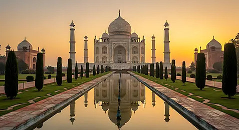 El Taj Mahal, ubicado en Agra, India, es uno de los monumentos más emblemáticos del mundo. Construido entre 1631 y 1653 por el emperador mogol Shah Jahan en memoria de su esposa Mumtaz Mahal, este mausoleo de mármol blanco simboliza el amor eterno. Su arquitectura combina estilos islámico, persa, indio y turco, rodeado de bellos jardines simétricos. Reconocido como Patrimonio de la Humanidad por la UNESCO en 1983, el Taj Mahal atrae a millones de visitantes cada año, fascinados por su belleza y su historia romántica.