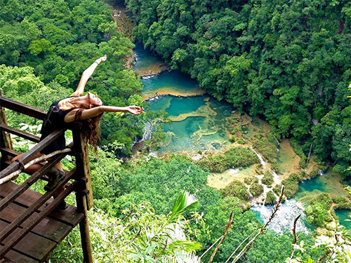 Semuc Champey fue una vez una atracción remota, pero hoy se ha convertido en uno de los mejores atractivos turísticos de Guatemala. Las piscinas en este lugar forman una escalera de piscinas de color turquesa que se extienden sobre un puente natural de piedra caliza. El agua proviene del Río Cahabón, que hace túneles subterráneos antes de volver a emerger. Este pintoresco lugar es uno de los mejores lugares de Guatemala para nadar y tomar el sol. El visitante puede realizar una caminata de 45 minutos a través de la selva hasta "El Mirador". La vista en la cima es preciosa, tanto de Semuc como delas exuberantes montañas verdes que la rodean.